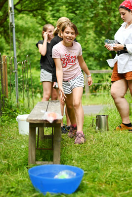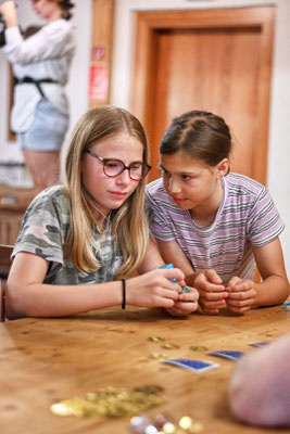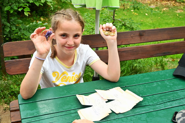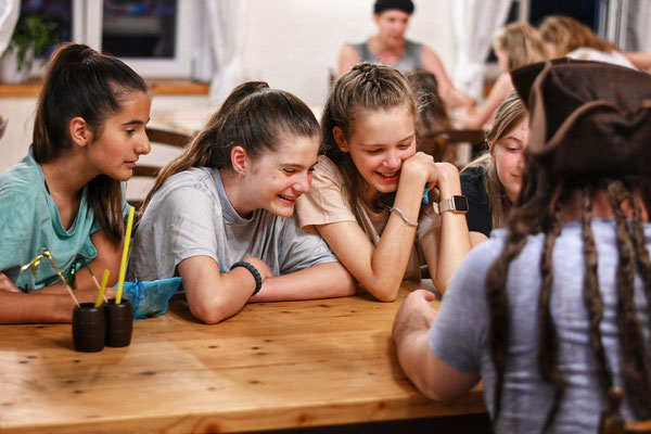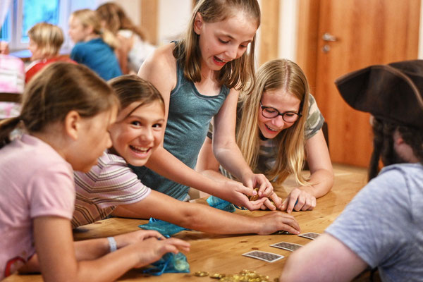 Heute haben die Kinder zwei Matrosen geholfen, die kurz vor ihrer Abschlussprüfung standen und noch Hilfe von den Kindern bei der Aufgabe „Schiffe versenken“ gebraucht haben. Mit kurzen Minispielen haben die Kinder sich „Schüsse“ erspielt. Der Nachmittag hat mit einer Basteleinheit begonnen, bei der die Kinder Fernrohre gestalten und bunte Origamifische falten konnten. Danach startete das bewegungsreiche Spiel „Entern“. Die Kinder mussten mit Wasserspritzpistolen ihren Goldschatz vor den Angreifern der anderen Gruppe verteidigen, und gleichzeitig den Schatz der Gegner plündern. Das heutige Tageshighlight war eindeutig der Piratencasinoabend. Die Kinder konnten bei den verschiedensten Croupiers ihre Piratenmünzen vervielfachen oder verlieren. Alle waren im Goldrausch.