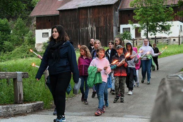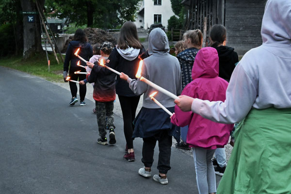 Wir sind um 11:05 in Meidling losgefahren und nach einer entspannten Zugfahrt, einem kurzen Besuch am Spielplatz und einem kleinen Spaziergang zu unserem Haus, sind alle Kinder und Leiter gut in Krieglach angekommen. Wir haben unsere gemeinsame Woche mit dem Lagerkreis begonnen in dem wir das traditionelle Jungscharlied gesungen und uns alle kurz vorgestellt haben. Danach haben die Kinder den gestrandeten Captain Matze und seine Crew kennengelernt, diese haben die Kinder um Hilfe gebeten, die verlorenen Teile ihres kaputten Schiffes wieder zu finden. Nach der wohlverdienten Stärkung bei dem vorzüglichen Abendessen, haben wir den Tag mit einer Partie Bärenjagd und einer Fackelwanderung ausklingen lassen.