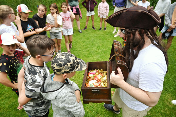 verfluchten Gold. Quer durch Wald und Wiese mussten die Kinder die fehlenden Münzen und versteckten Edelsteine finden und konnten den verfluchten Captain und seine Crew dadurch befreien. Nach dem